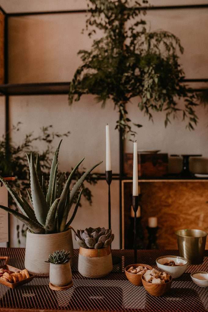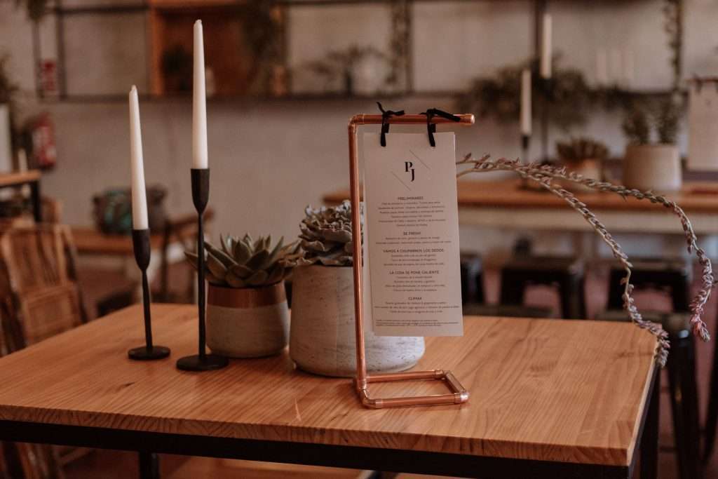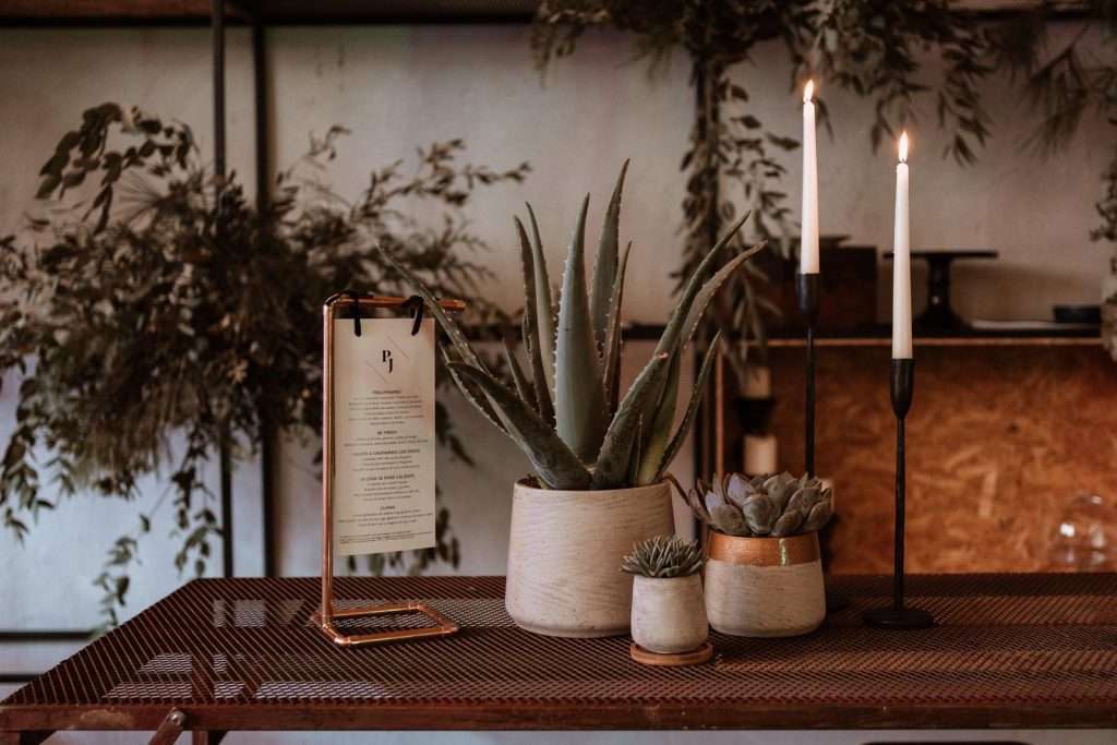 Hicimos una propuesta de diseño en el que incluimos jardines verticales, cactus, suculentas y plantas colgantes, detalles decorativos industriales, como los centros de las plantas de las mesas, los portavelas, todo acompañado con cartelería de diseño.